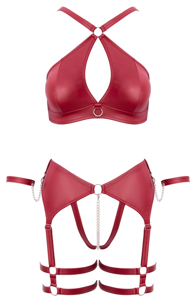 Emocionante conjunto de lencería de Cottelli BONDAGE con sujetador suave, liguero sin entrepierna y esposas suaves. Todo en un elegante color rojo oscuro mate con accesorios plateados. Elástico y suave en todo el cuerpo para mayor comodidad. Sujetador de diseño ingenioso con un aro entre las copas blandas. Los tirantes y el cierre de gancho en la espalda son ajustables. El tanga sin entrepierna tiene un seductor aspecto de liguero con tiras dobles en los muslos. Los tirantes y las ligas también se pueden ajustar. Entrepierna totalmente abierta con cadena estimulante extraíble. Anillas decorativas en los tobillos delante, a los lados y detrás para sujetar las cadenas de mosquetón a las esposas. Las suaves correas de los tobillos pueden ponerse y ajustarse rápidamente con sus cierres de velcro.