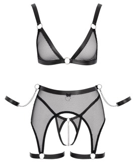 Provokerende lingerisæt fra Cottelli BONDAGE med trekant-bh, strømpeholder, åben g-streng og bløde håndjern. Sensuelt mesh med detaljer i mat look og sølvfarvet tilbehør. Elastisk og blødt over det hele for høj komfort. Trekant-bh med ring mellem de bløde skåle og ringe på de justerbare stropper. Strømpeholder med justerbare lårstropper. Dekorative lænkeringe foran, i siderne og bag på linningen til fastgørelse af karabinhager med håndjern i mat look. De bløde lænker kan hurtigt tages på med deres velcrolukninger og justeres, så de passer. Fræk net-g-streng med stimulerende kæde i det åbne skridt.