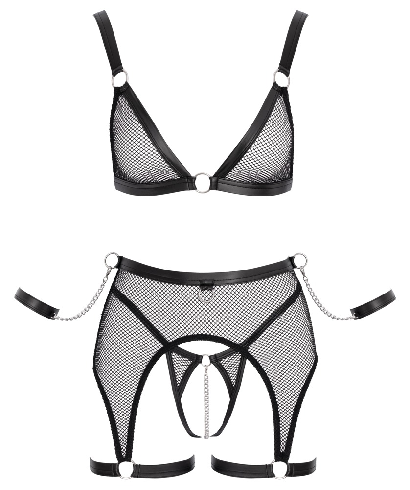 Provocativo conjunto de lencería de Cottelli BONDAGE con sujetador de triángulo, liguero, tanga abierto y suaves esposas. Sensual malla con detalles de aspecto mate y accesorios plateados. Elástico y suave en todo el cuerpo para una mayor comodidad. Sujetador de triángulo con anilla entre las copas blandas y anillas en los tirantes ajustables. Liguero con tirantes ajustables en los muslos. Anillas decorativas en los tobillos, delante, a los lados y detrás de la cintura, para fijar las cadenas de mosquetón con las esposas de aspecto mate. Las suaves correas de los tobillos se colocan rápidamente con sus cierres de velcro y se ajustan a la medida. Descarado tanga de rejilla con estimulante cadena en la entrepierna abierta.
