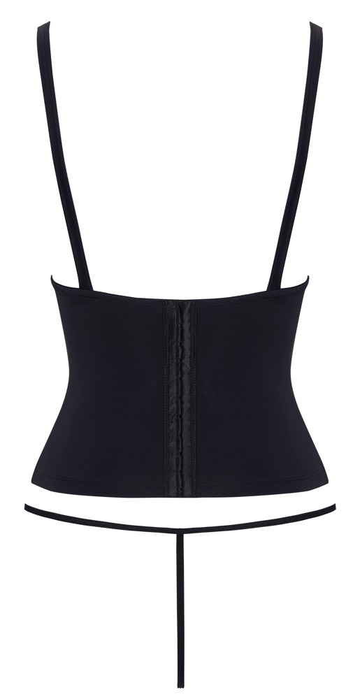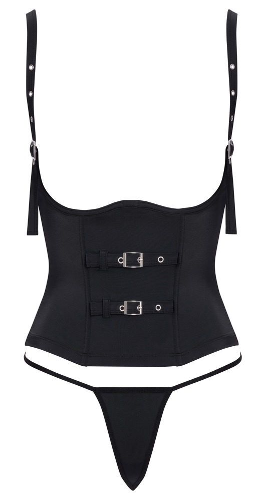 The black waist corset from Cottelli PARTY has adjustable buckle bra straps and underwired cups that slightly support the exposed breasts. There are two integrated shaping wires at the front and two decorative, adjustable buckle straps at the front as well. With a hook fastener at the back. It can be worn on its own as a sensual eye-catcher. It can also be worn underneath a shirt or blouse as a stylish corset for curve-enhancing styles. It is soft and stretchy for a very comfortable fit. The matching mini string is included!