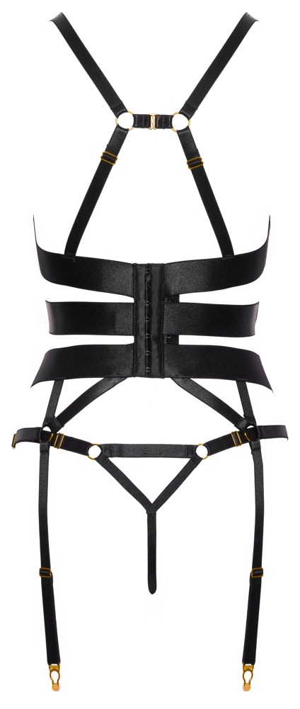 A black suspender corset and crotchless string in a set from Cottelli LINGERIE. The set is in a stylish and detailed design with stretchy straps in an elegant satin look and gold-coloured accessories. The set is soft and stretchy for a very comfortable fit. The bra straps are connected by another strap that has a hook fastener. The bra straps, the numerous straps on the cups and the suspender straps can be adjusted for a perfect fit. The strap string is seductively crotchless and also revealing in lots of other places as well.