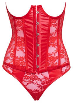 An open cup corset and thong in a set from Cottelli LINGERIE. The corset is made out of fiery red materials – a mix of lace and wetlook. The set is soft and stretchy for a very comfortable fit. The corset has wires underneath the uncovered breasts to support them. There are 6 integrated shaping wires per side. There is a hook fastener at the front and decorative satin lacing at the back. There is a strip of material underneath the lacing. The matching thong is made entirely out of red lace.