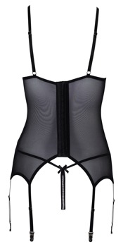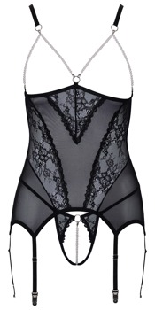 Bröstfri strumpållartop och string i ett svart öppet set från Cottelli LINGERIE. Av fint powernet med fina spetsinsatser framtill. Mjuk och elastiskt för maximal komfort. Vita pärlkedjor ramar in de nakna brösten. Pärlkedjorna sätts fast i ringarna med karbinhakar. Axelbanden kan justeras. Baktill har strumphållartoppen en hakknäppning. De 6 strumphållarna kan justeras i längd. Den matchande stringtrosan med öppen spetsfront har en stimulerande pärlkedja som kan tas av.