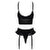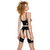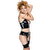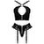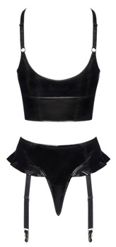 Winylowy komplet od Black Level z krótkim topem na ramiączkach i pasem do pończoch. Błyszcząca czerń z metalowymi dodatkami w srebrnym kolorze. Winylowy top z dużym pierścieniem w obficie odsłoniętym dekolcie. Z krótkim zamkiem na całej długości z przodu. Ramiączka są regulowane z tyłu. Pasujące winylowe szelki, również z zamkiem błyskawicznym z przodu. Kokieteryjna falbanka w pasie. Regulowane szelki są całkowicie odpinane.