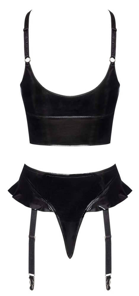 Lak-sæt fra Black Level med kort stroptop og riostreng med strømpebånd. I skinnende sort med sølvfarvet metaltilbehør. Lak-top med en stor ring i det generøst udskæring. Med en kort lynlås i fuld længde foran. Stropperne er justerbare ved den åbne ryg. Matchende lak-streng med strømpebånd, også med lynlås foran. Koket flæsedekoration på linningen. De justerbare strømpebånd er helt aftagelige.