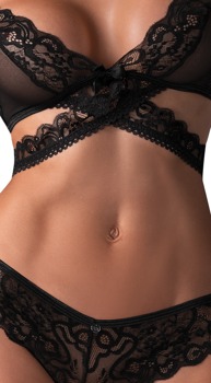 The 2-piece, transparent back set, Blomentis from Obsessive contains a bra and briefs. It is made out of a delicate mixture of materials. The materials are beautiful lace and delicate stretchy tulle. The set is soft and stretchy for a very comfortable fit. The bra has a small bow between the wireless cups and there are also strips of lace that cross over underneath the breasts- The straps can be adjusted to fit. There is a small decorative detail at the front of the lace briefs.