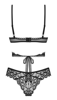 2-teiliges schwarz-transparentes Set Blomentis von Obsessive mit BH und Slip. Feiner Material-Mix aus opulenter Spitze und feinem Stretchtüll. Rundum weich und elastisch für hohen Tragekomfort. BH mit Schleifchen zwischen den soften Cups und sich kreuzenden Spitzen-Unterbrustbändern. Die Träger sind passend verstellbar. Spitzen-Slip vorne mit kleinem Schmuckdetail.