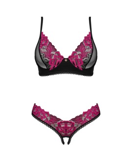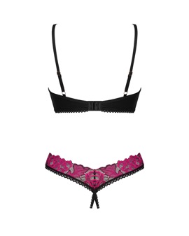 Underwired bra and crotchless thong in the Rosenty set by Obsessive. Soft black mesh and fine pink rose lace in a stylish mix with opaque black stretch material. Bra with a decorative element between the underwired cups and an adjustable hook fastener at the back. The straps can also be adjusted to fit. The thong with a beautiful lace waistband is seductively open at the crotch.