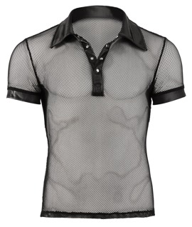 Masculine polo shirt with press studs that stop at the chest. The shirt is made out of a seductive mixture of net and wet look and is sure to grab everyone's attention.