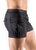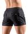 Schwarze, locker geschnittene Shorts von Svenjoyment aus leichtem Stretchmaterial mit trendigem matten Finish. Im Worker-Style mit Druckknopfleiste vorne, sowie 2 großen Taschen seitlich und 2 aufgesetzten Taschen auf dem Po – alle Taschen mit Druckknopfklappe.