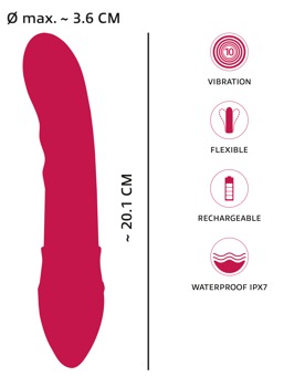 Den smukt formede silikonevibrator vibrerer særligt kraftigt i hovedet. 10 vibrationstilstande kan bekvemt styres direkte på legetøjet med et tryk på en knap. Stråledysen til vandet er også placeret i hovedet. Til brug i brusebadet skrues vibratorens endestykke blot af, og vibratoren skrues derefter på bruseslangen. Vibratorens skruegevind passer til enhver standard bruserslange. Naturligvis kan vibratoren også bruges på mange forskellige måder uden vandtilslutning.