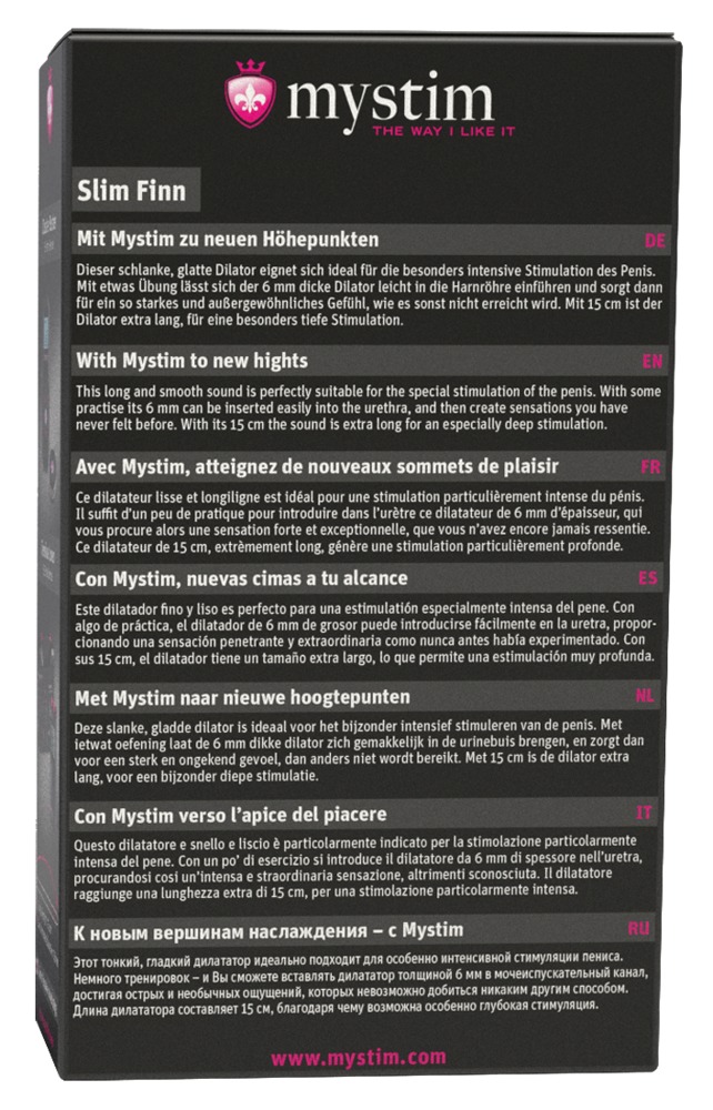 Этот тонкий, гладкий расширитель Slim Finn от Mystim идеально подходит для особо интенсивной электростимуляции уретры. Расширитель изготовлен из медицинского алюминия и тщательно отполирован вручную. Перед использованием его можно нагреть на радиаторе или охладить в холодильнике.