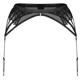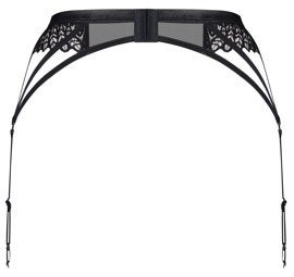 The transparent black suspender belt, Donarella, from Obsessive has elaborate embroidery at either side. It is soft and stretchy for a very comfortable fit. 4 stretchy straps join together to make one adjustable suspender strap at either side of the suspender belt. There is a hook fastener at the back. There is a small decorative element at the front of the waistband.