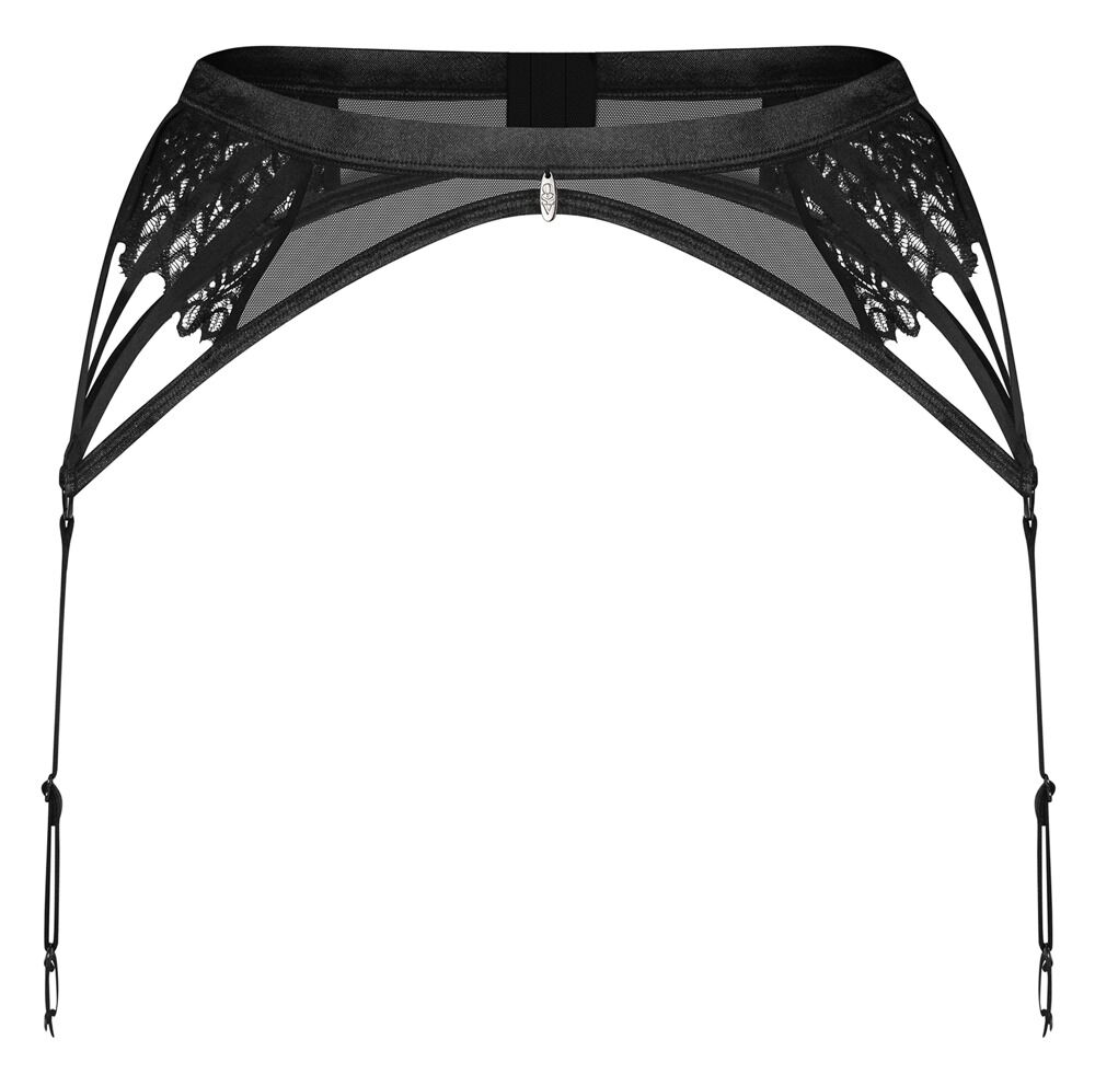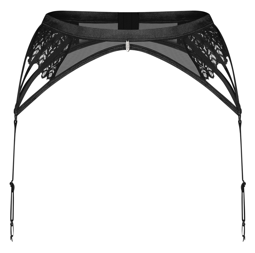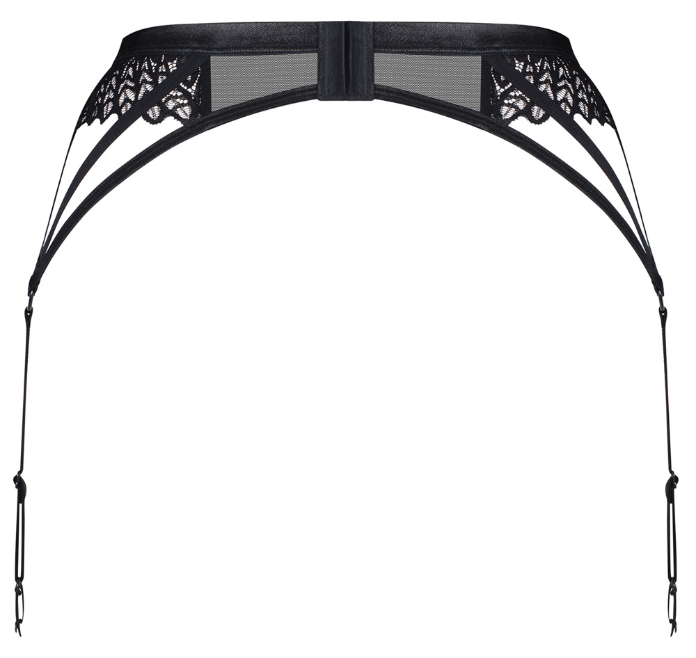 Schwarz-transparenter Strapsgürtel Donarella von Obsessive mit aufwendigen Stickerei-Einsätzen seitlich. Weich und elastisch für hohen Tragkomfort. Je 4 Stretchbänder vereinen sich jeweils seitlich zu einem verstellbaren Strumpfhalter. Im Rücken mit Hakenverschluss. Vorne am Bund mit kleinem Schmuckelement.