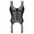 Sort, gennemsigtig corsage Arrowel fra Obsessive i en figursyet stil. Med fine blonder på de dobbelte, bløde bøjle-skåle. Elastisk og blød over det hele. De dobbelte stropper og hægtelukningen bagpå er justerbare, og det samme er strømpeholderne.
