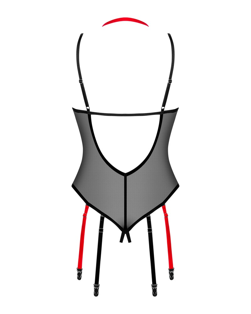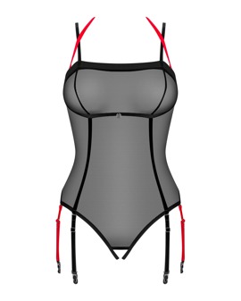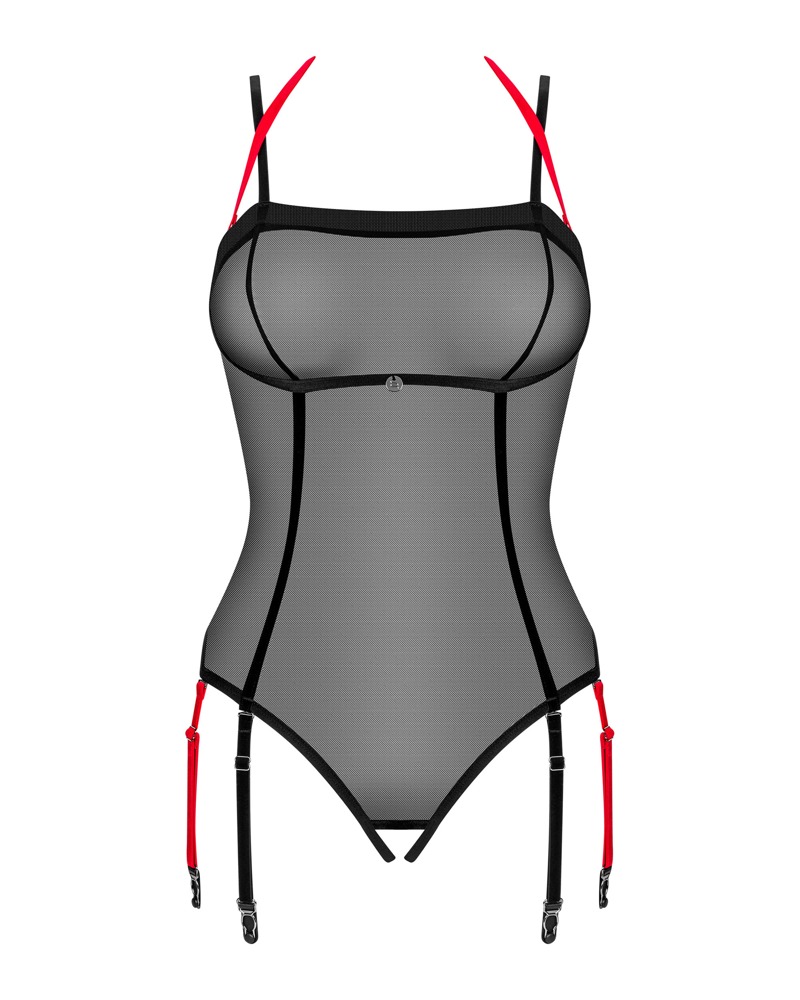 Gjennomsiktig strengbody Glandez fra Obsessive med avtagbar halterneck. Strømpeholderne er også avtagbare. Innbydende åpent skritt.