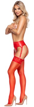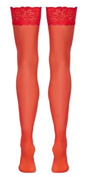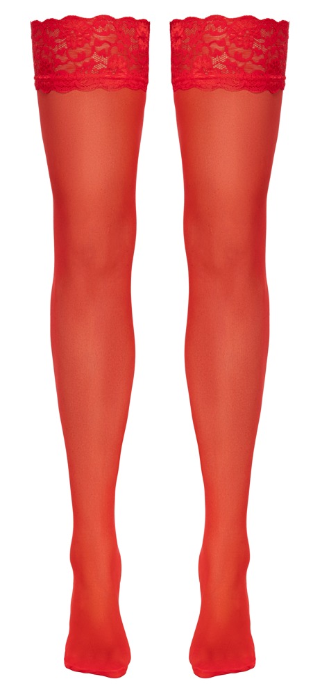 The velvety soft, red stockings from Cottelli LEGWARE have stretchy 9 cm wide lace around the top. 20 denier. Oeko-Tex certified.
