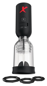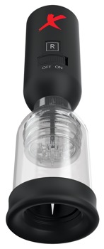 Sugende penishovedpumpe med vibration til betjening med én hånd. Med stimulationsnopper indvendigt. Samlet længde 24,2 cm, indføringsdybde 7 cm, Ø 5 cm, åbnings-Ø 3,5 cm, kan strækkes. Transparent/sort. ABS, silikone. Inklusiv 3 penisringe, glidecreme og cleaner. Batterier: 2 x AA (medfølger ikke).